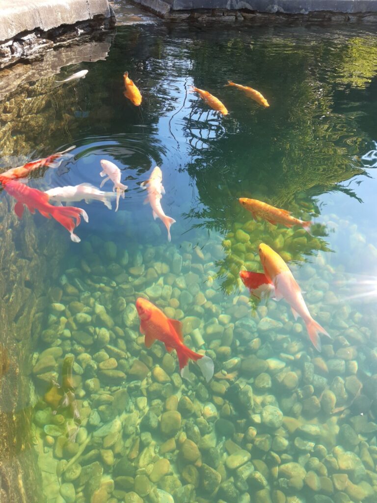 Rybičky různých barev, možno je každé letní ráno nakrmit připravenými granulkami, i navštívit 🙂