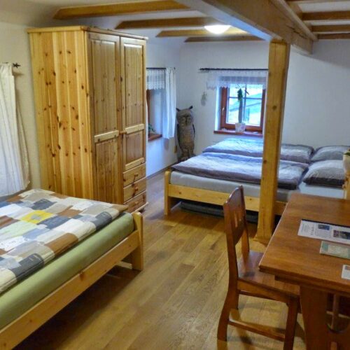 SRDCE – prostorný pokoj s manželskou postelí a japonským futonem. Můžeme přidat dětskou postýlku